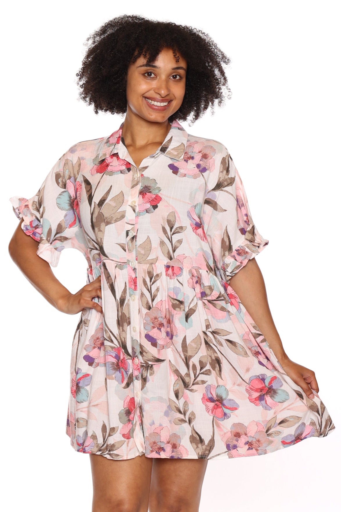 Breezy, beautiful, and made for summer days — the Blush Bloom Relaxed Fit Mini Dress is the epitome of effortless charm. Designed in a loose, airy silhouette and crafted from lightweight 100% rayon, it moves with you and keeps you cool. The dreamy floral print in soft pinks and pastels pairs with delicate ruffle-trim sleeves and a button-front design for an easy, throw-on-and-go look. Whether you're heading to a picnic, a weekend getaway, or just soaking up the sun, this dress brings the vibe.