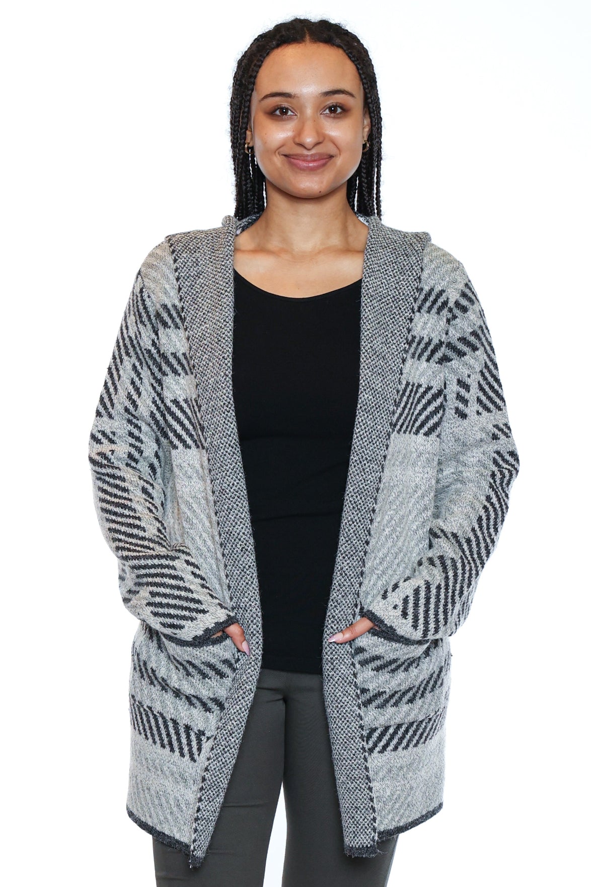 Stay cozy and stylish in this patterned open-front cardigan. Featuring a relaxed fit, front pockets, and a soft hood, this piece blends comfort with casual sophistication. Its unique geometric knit design adds a modern touch that elevates everyday looks.