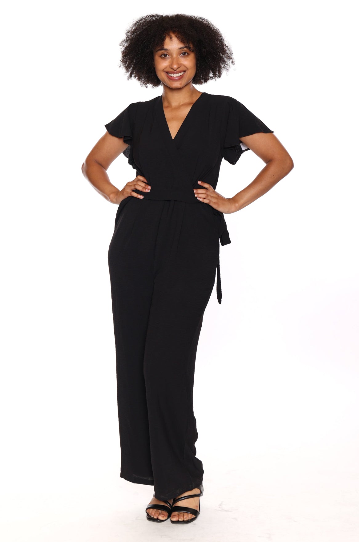 Sleek, elegant, and effortlessly flattering, The Classic Wrap Jumpsuit is a wardrobe essential for any occasion. Featuring a soft V-neckline, flutter sleeves, and a wrap-style waist tie, this all-black design combines comfort with timeless sophistication. The fabric has a gentle stretch for ease of movement and a comfortable fit, and it runs true to size—no guessing required. Perfect for workdays, evenings out, or casual events—just add your favorite accessories and go.