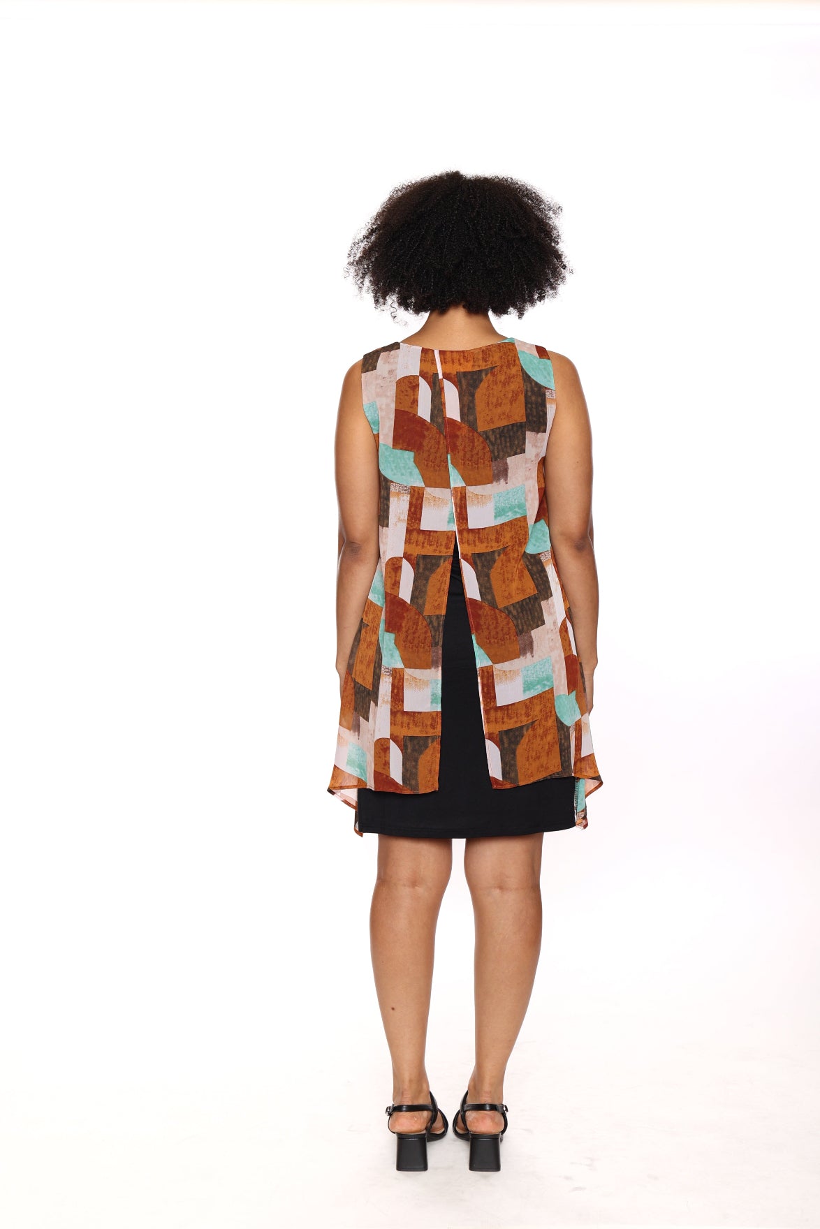 Turn heads with the Sienna Printed Dress, a graceful blend of structure and flow. This rust-printed overlay adds dimension and movement, draping delicately over a stretchy black lining made from a comfortable blend of polyester and spandex. The back slit detail adds a subtle touch of drama, perfect for dancing the night away or making an elegant entrance.