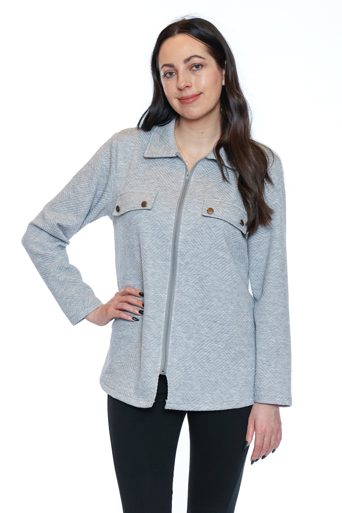 This zip-front shirt jacket is the perfect mix of casual comfort and refined style. Designed with a collared neckline, long sleeves, and functional chest pockets, it offers a relaxed silhouette that layers easily over tees, knits, and blouses. The zip closure gives it a clean, modern finish — making it a versatile go-to for everyday wear.