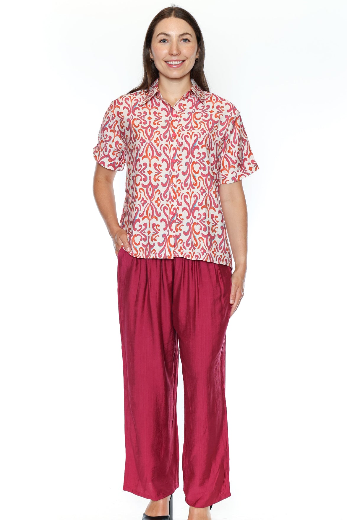 This vibrant two-piece set combines effortless style with everyday comfort. The short-sleeve button-down top features a lively allover print, a classic collar, and a relaxed silhouette that drapes comfortably for all-day wear. Paired with flowy wide-leg pants, the set moves beautifully with each step and offers an elevated yet easy look. Perfect for warm weather, travel, brunch, or casual outings where comfort and color make the outfit.