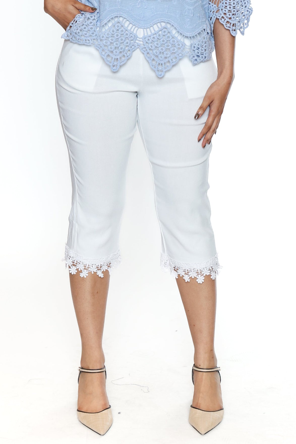 These chic lace-trim capri pants offer the perfect blend of comfort and elegance. Designed with a smooth pull-on elastic waistband, convenient pockets, and a soft stretch fabric, they deliver effortless everyday wear. The daisy-pattern lace hem adds a feminine touch, making them versatile enough for both casual outings and dressier occasions. Pair them with tanks, blouses, tunics, or layered looks year-round.