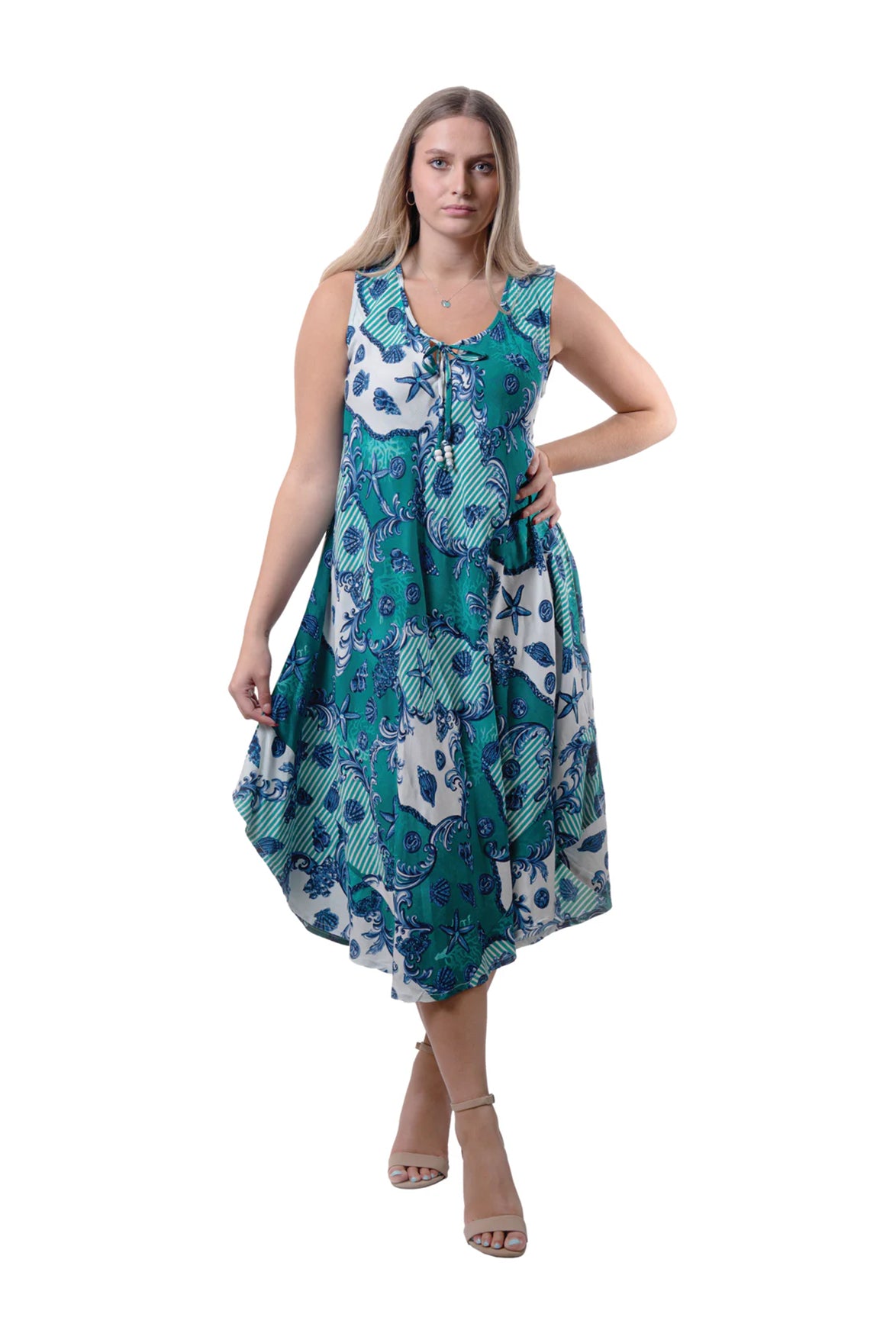 One size rayon printed umbrella dress. Great for everything from the beach or summer lunches.